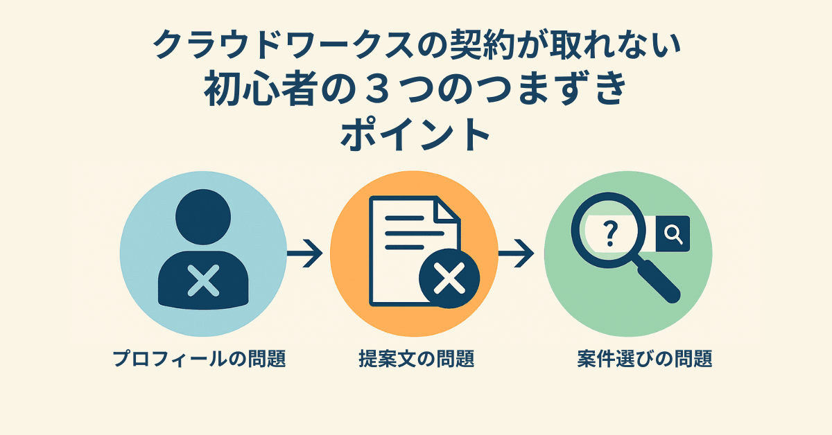実は、初心者がクラウドワークスで案件を取れない原因には、いくつかの共通パターンがあります。逆に言えば、つまずきポイントさえ押さえれば、未経験でも最初の1件にたどり着けるということ。